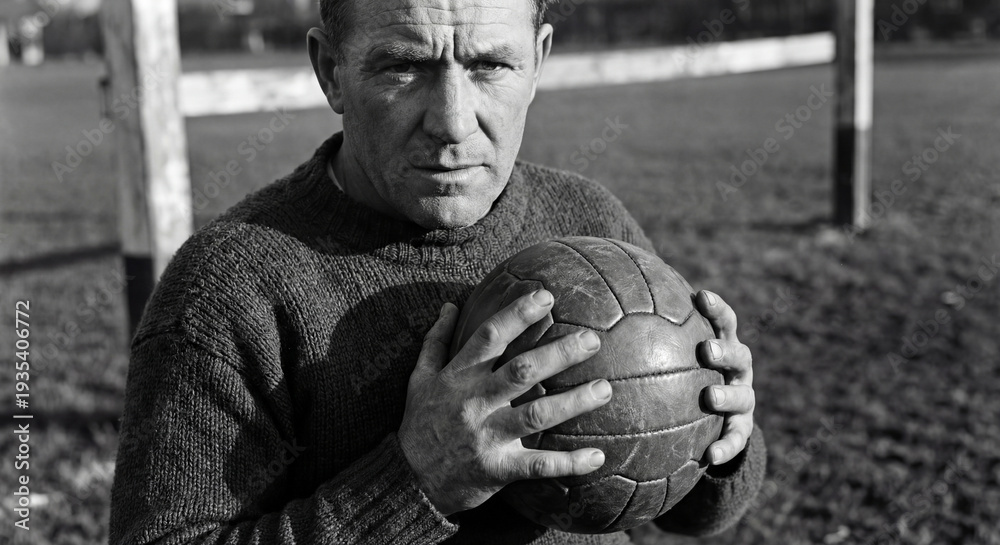 Close-up monochrome portrait of a serious veteran goalkeeper in a dark turtleneck sweater holding a vintage leather ball with both hands during a historical training session on a muddy pitch #1935406772