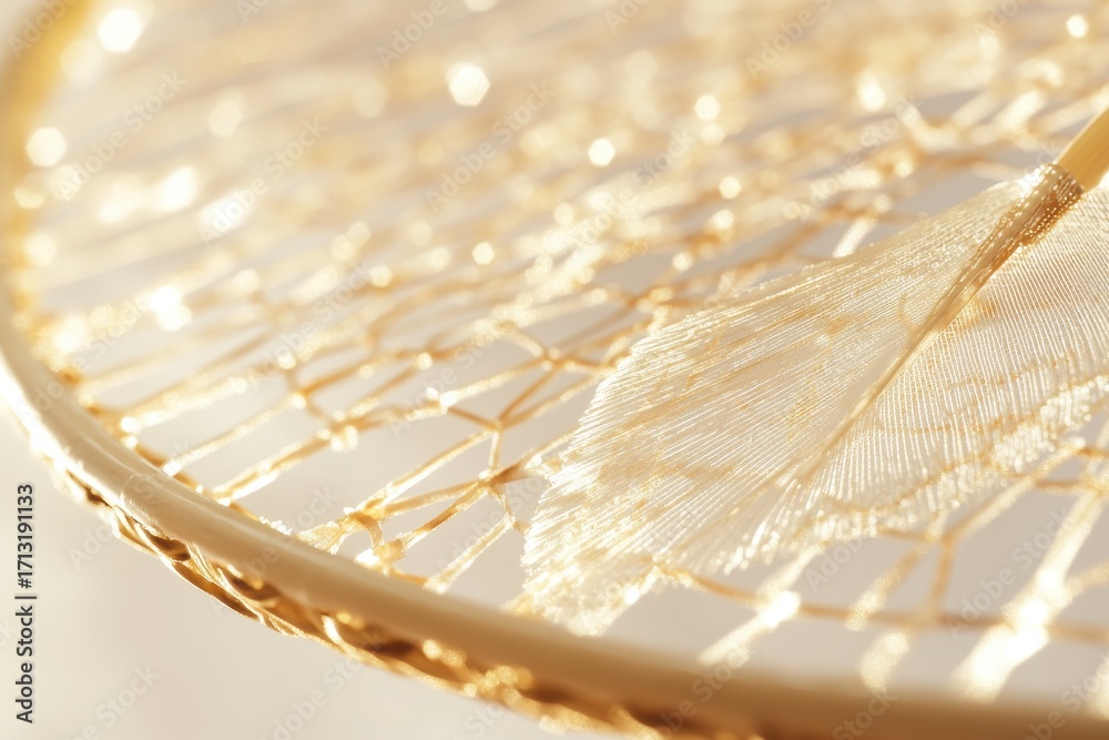 Close-up of a beautifully crafted golden fan resting on an intricate, textured surface. #1713191133