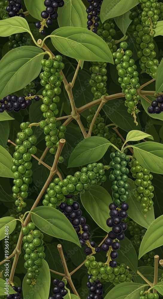 Close-up of a Black Pepper Plant with Green and Ripe Berries. #1936912480