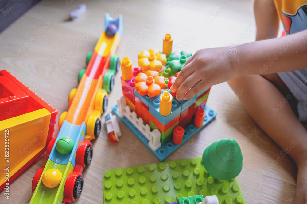 Close-up of a child’s hand playing with colorful plastic building blocks. Articles about children’s play or imagination and motor skill development. #1820539723