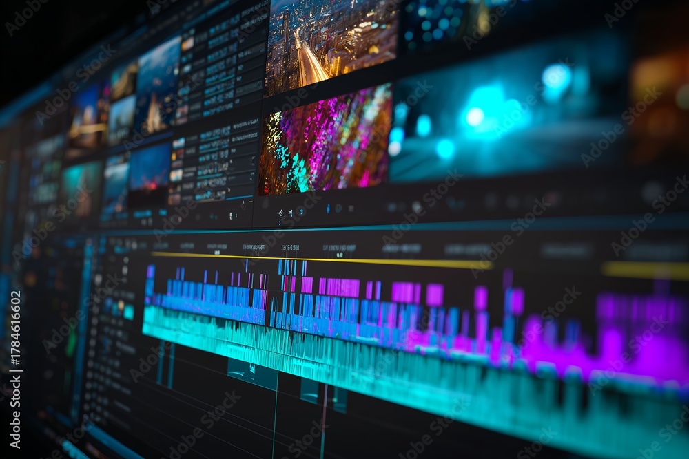 Close up of a computer screen showing video editing software interface with various clips and waveforms, concept for video production, post production and motion graphics design #1784616602