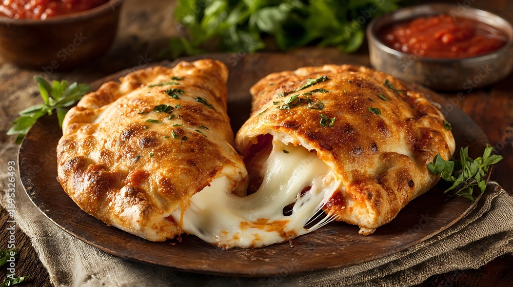 Close up of a freshly baked cheesy calzone sliced open with melty filling stretching on rustic table setting #1595326493