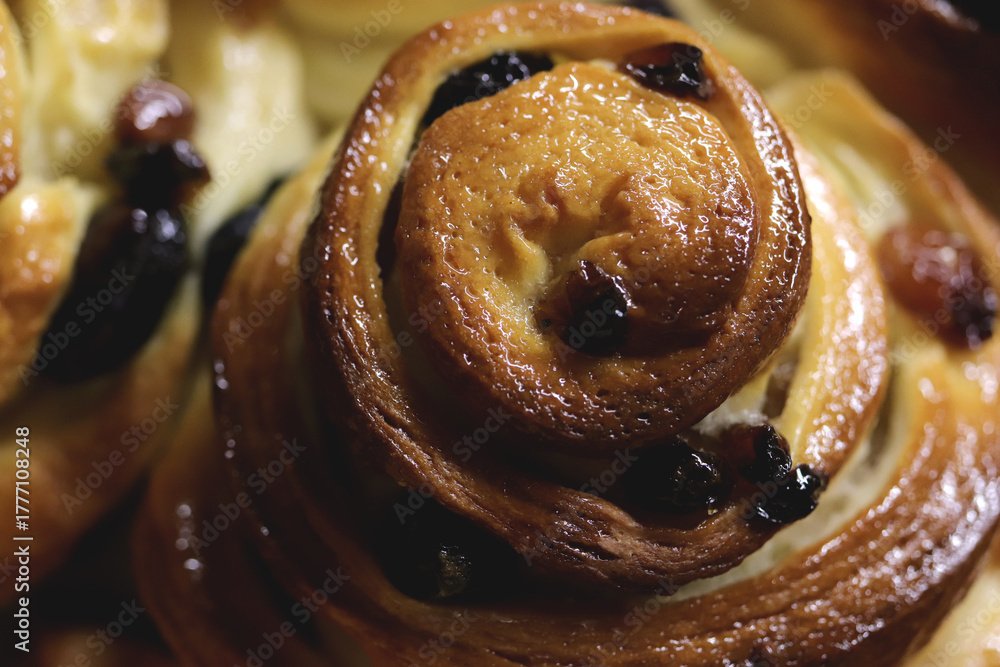 Close-up of a freshly baked cinnamon roll with raisins. #1777108248