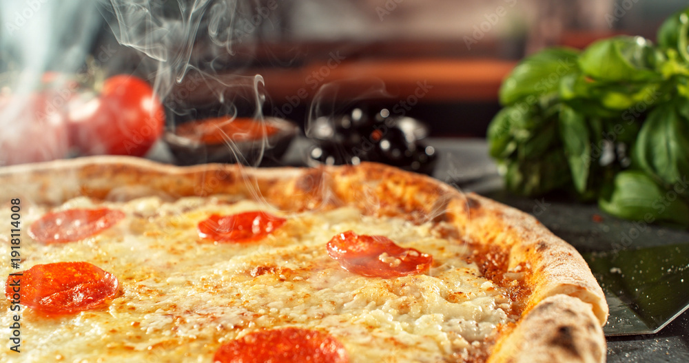 Close-up of a freshly baked pizza with melted cheese and golden crust in warm, appetizing light. Classic comfort food concept with rich texture and inviting presentation. #1918114008