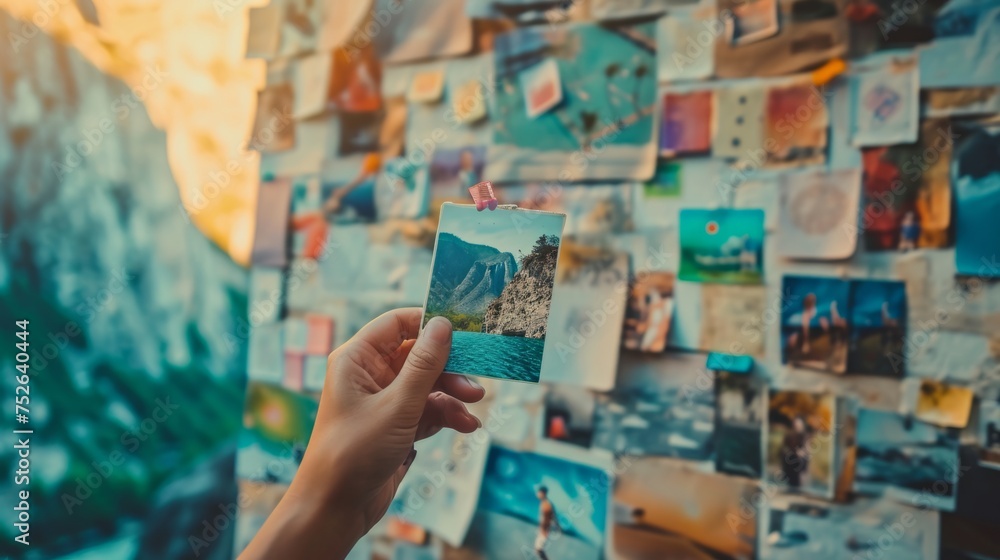 Close-up of a hand holding a vision board filled with images representing personal goals for the upcoming year. generative ai #752640444