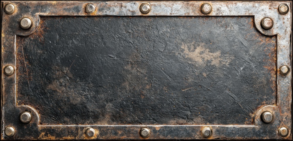 Close-up of a vintage metal signboard with rivets and weathered texture #1773392336