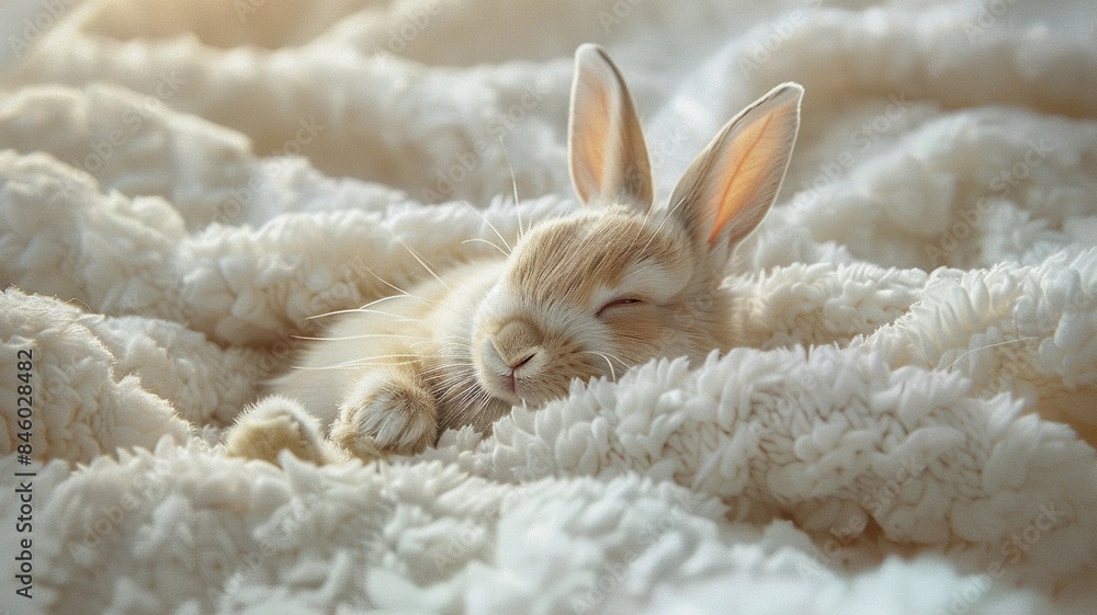 Close-up of an adorable brown rabbit sleeping in a cozy fur blanket, highlighting comfort and cuteness. #846028482