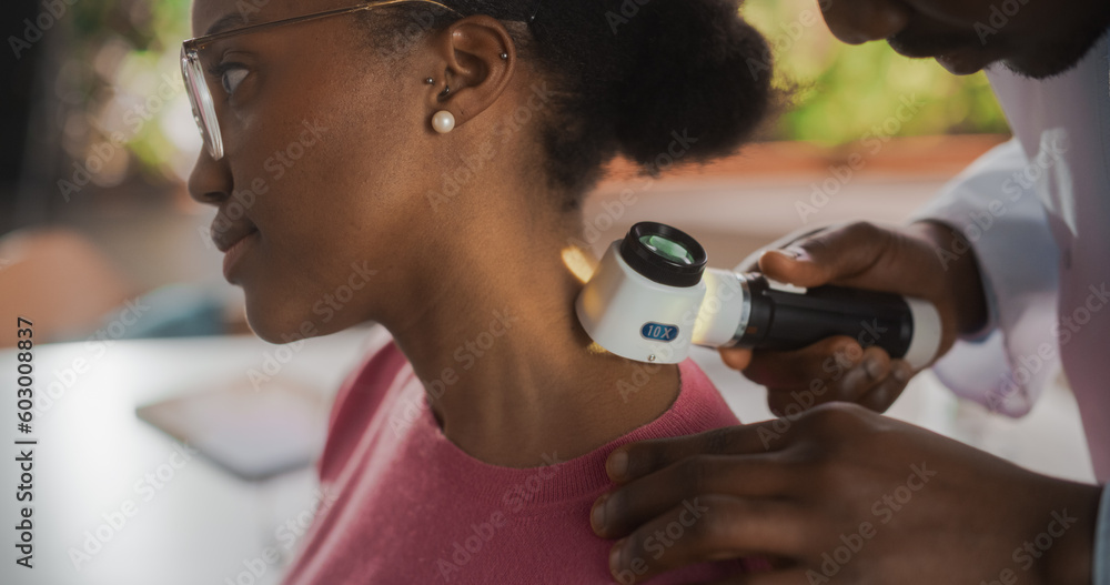 Close Up of an African Skin Care Professional Using a Dermatoscope to Examine Neck Tissue on the Skin of a Young Black Female During a Health Check Visit to a Clinic. Dermatologist in Hospital #603008837