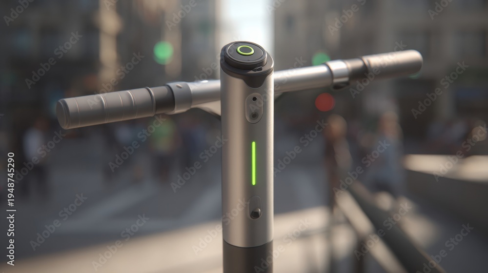 Close-up of an illuminated electric scooter charging port with green indicator light on handlebar in an urban setting. #1948745290