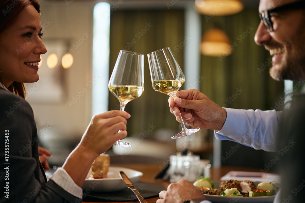 Close up of business couple toasting with wine in restaurant. #1735575453