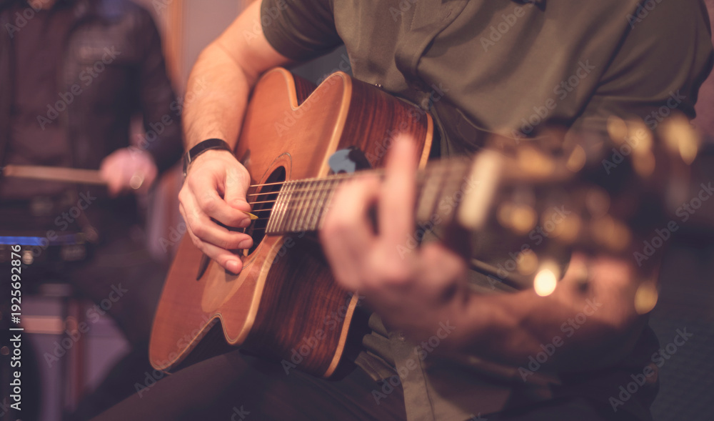 Close-up of Creative Artist Playing Acoustic Guitar During Rehearsal #1925692876