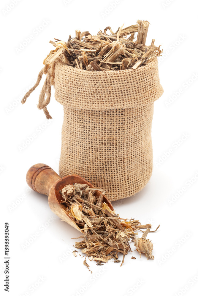 Close-up of Dry Organic Canna Lily (Canna) flowers and stems, in a jute bag and on a scoop, Isolated on a white background. #1393393049