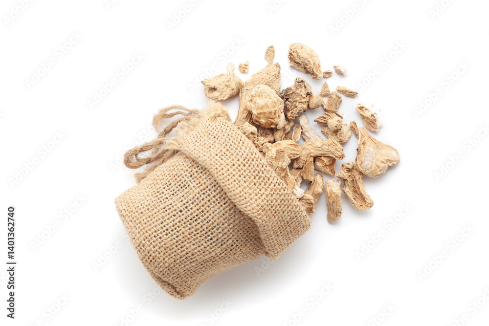 Close-up of Dry Organic Ginger Root (Zingiber officinale) or sonth, spilled out from a laying jute bag. Isolated on a white background. #1401362740