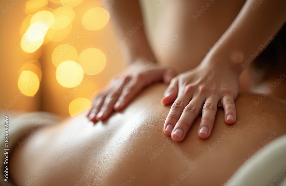 Close-up of hands giving a therapeutic back massage with oil. Soft bokeh lights create a relaxing atmosphere in a spa or wellness setting. Enjoying bodywork for rejuvenation and stress relief. #1875947569