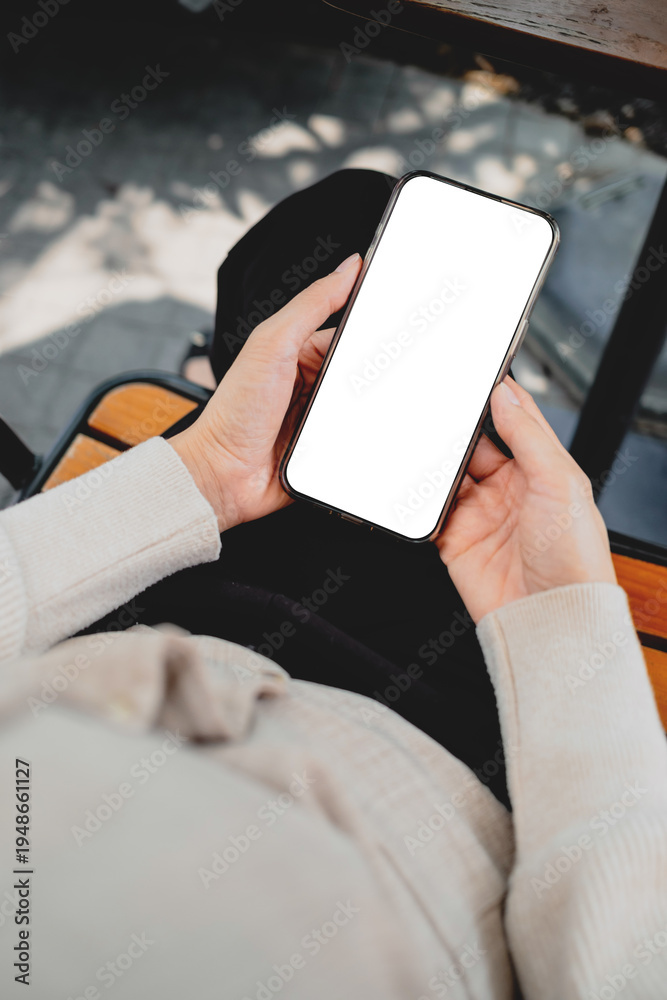 Close-up of hands holding a blank smartphone screen outdoors on a wooden bench, ideal for app mockups, mobile UI design, advertising, and digital marketing concepts. #1948661127