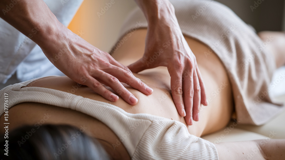 Close-up of hands performing back massage, showcasing skin texture and gentle touch, representing relaxation, wellness, and therapeutic treatment #1367776117