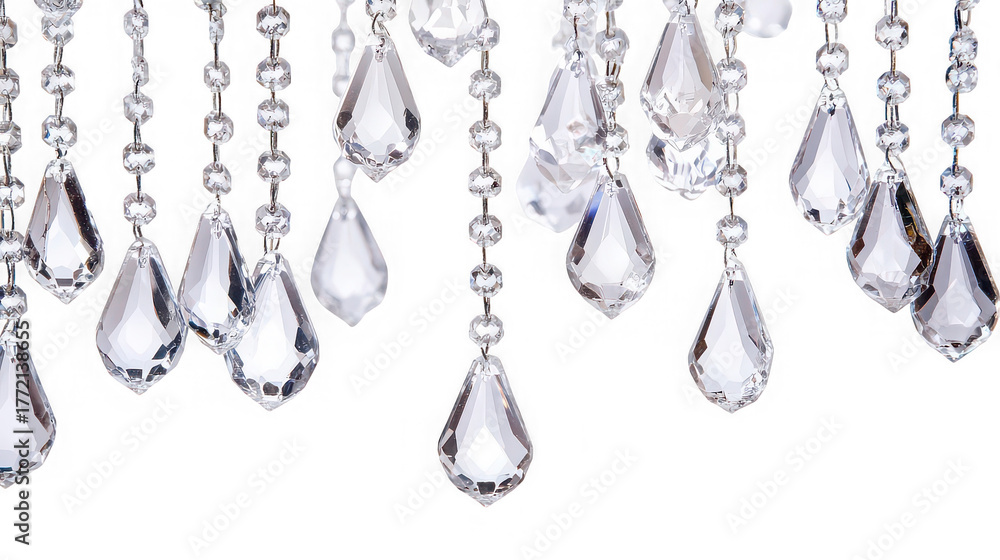 Close up of hanging crystal chandelier pendants on strings against a black background studio shot #1772138655