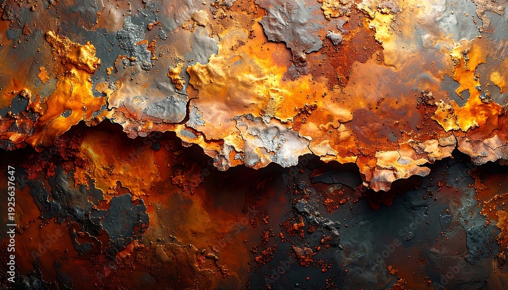 Close-up of intensely textured, aged metal. Varied hues of orange, brown, and grey suggest corrosion and decay, emphasizing the passage of time #1925637647