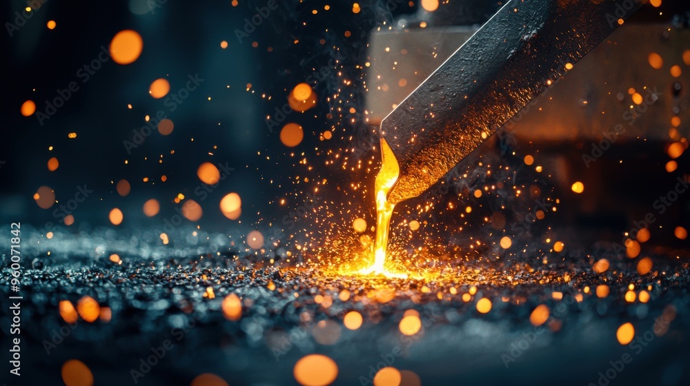 Close-up of molten metal pouring into a sword-shaped mold in a medieval forge, showcasing the intricate details of the mold and the glowing, #960071842