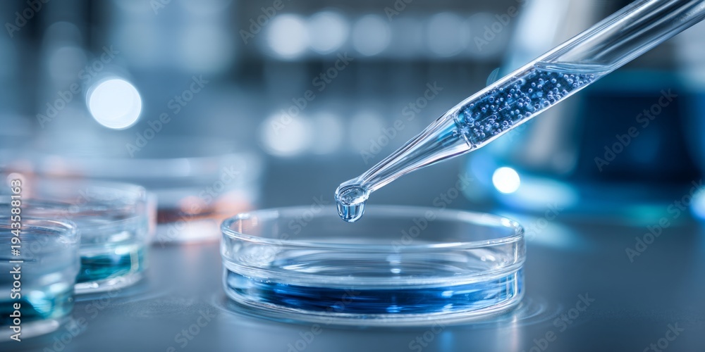 Close-Up of Pipette Dropping Liquid into Petri Dish on Laboratory Table with Soft Focus Background of Clear Test Beakers and Scientific Equipment #1943588163