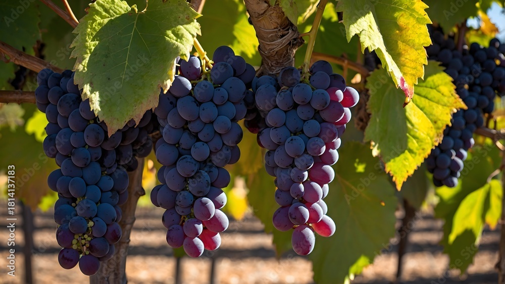 close-up of ripe grapes hanging on vine in vineyard, bathed in sunlight. The grapes are a deep purple color, and the leaves are a vibrant green #1814137183