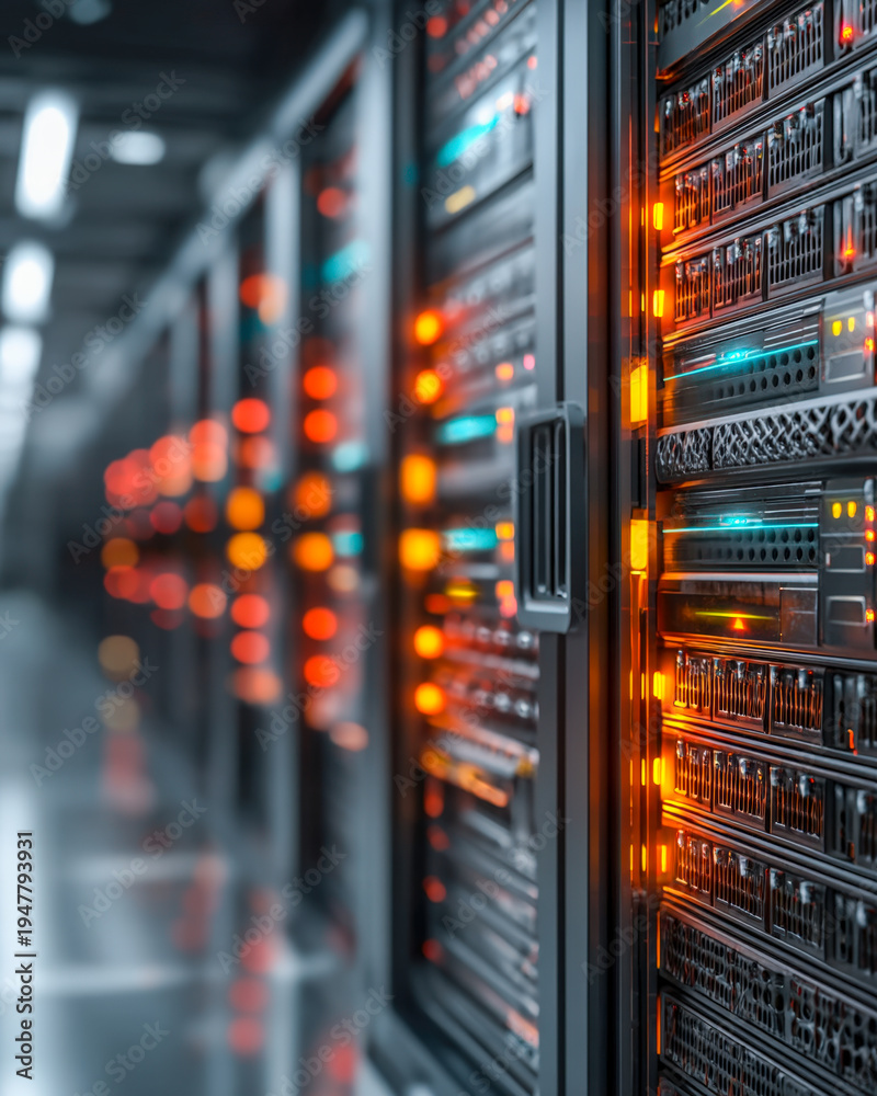 Close-up of server rack front panel with ventilation grid and subtle LED lights in modern data center #1947793931