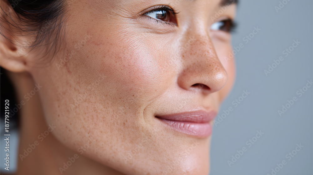 Close up of smiling woman with smooth skin and natural freckles showing healthy complexion and soft focus highlighting gentle facial features #1877921920