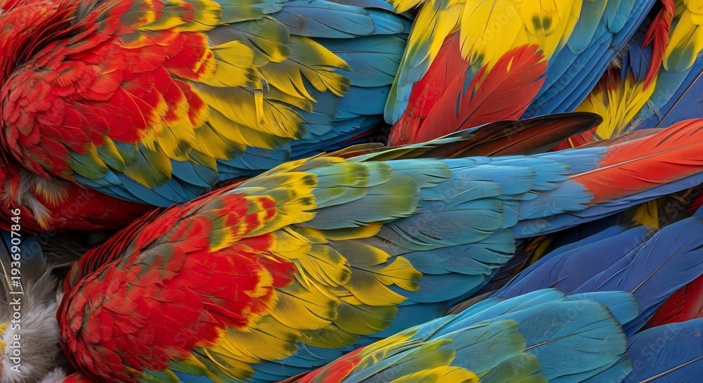 Close up of vibrant macaw parrot feathers in a colorful display. #1936907846