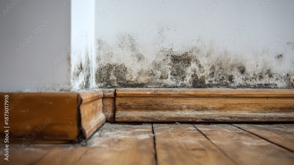 Close-up of wall and baseboard, showcasing mold growth. The floor is wooden. Corner of wall meets baseboard #1873017918