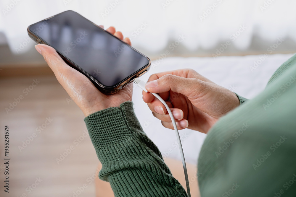Close-up of woman hands plugging USB cable into smartphone. Symbolizing battery charging, power supply, mobile technology and daily device usage. #1955231579