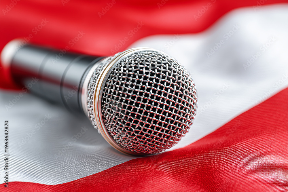 Close up on a Microphone on Austrian flag background, radio or music live show event, international song contest in Austria #1963642870