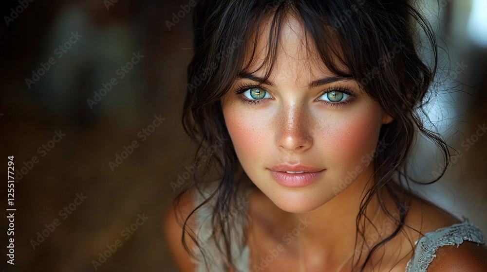 Close-up portrait of a beautiful young woman with green eyes and soft makeup. #1255177294