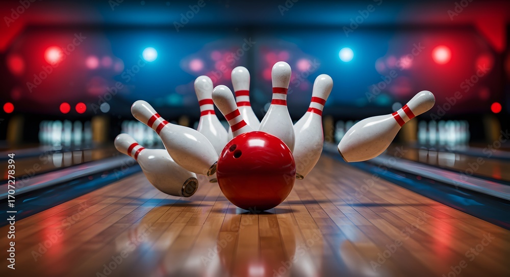 Close-up shot of a red bowling ball striking tenpins in a dimly lit bowling alley with vibrant blue and red lighting, capturing the dynamic action and excitement of the #1707278394
