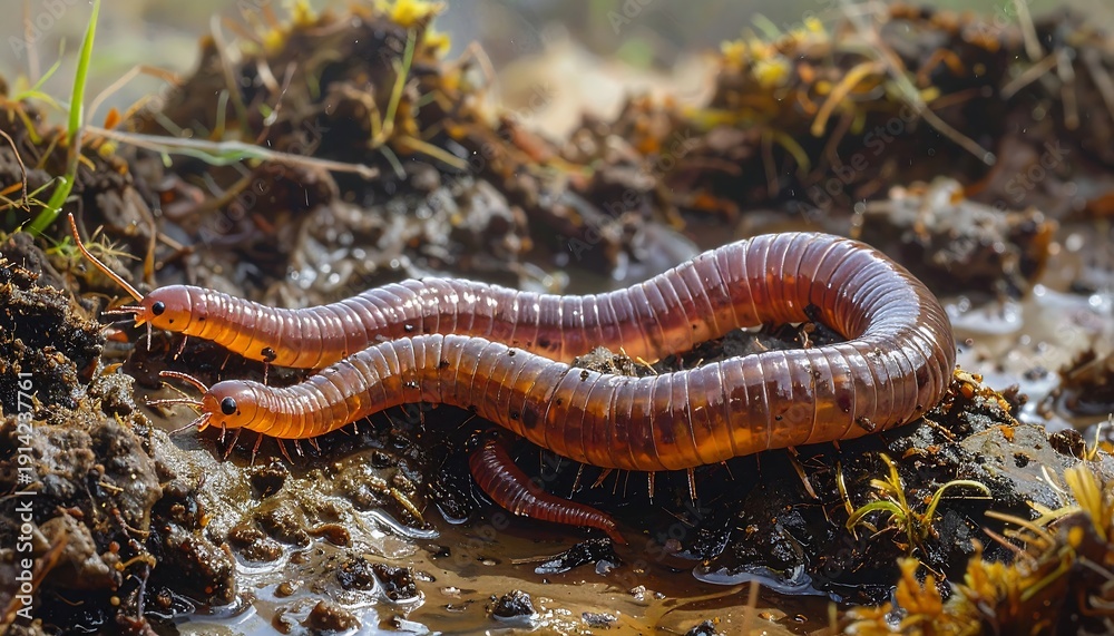 Close-up showcases a group of brown, elongated invertebrates with numerous legs crawling through damp, earthy terrain #1914237761