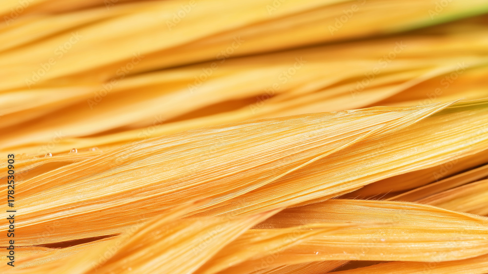 Close up textures of corn husk with golden fibers and water droplets, natural abstract pattern in warm light #1782530903