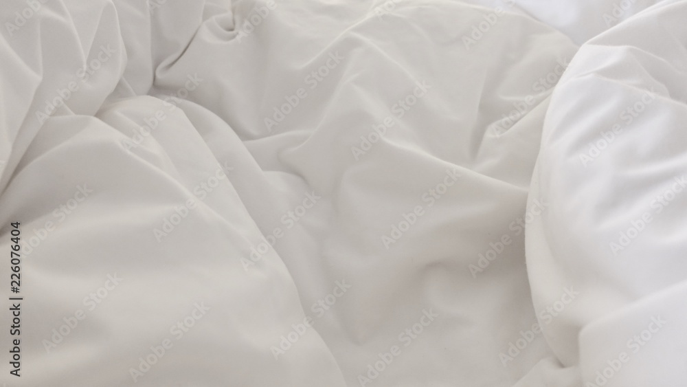 close up top view of white pillow on bed and with wrinkle messy blanket in bedroom, from sleeping in a long night. #226076404
