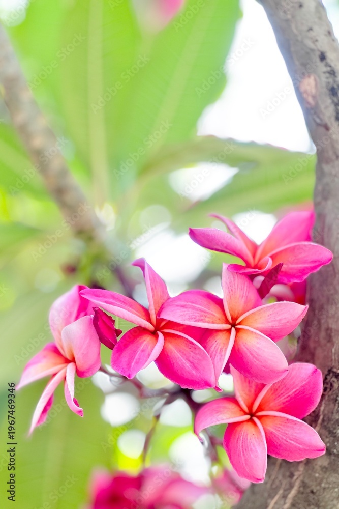 Close-up video of vibrant pink plumeria blossoms blooming against a clear blue sky. Tropical frangipani flowers gently sway in natural daylight, capturing fresh spring beauty and serene outdoor #1967469346