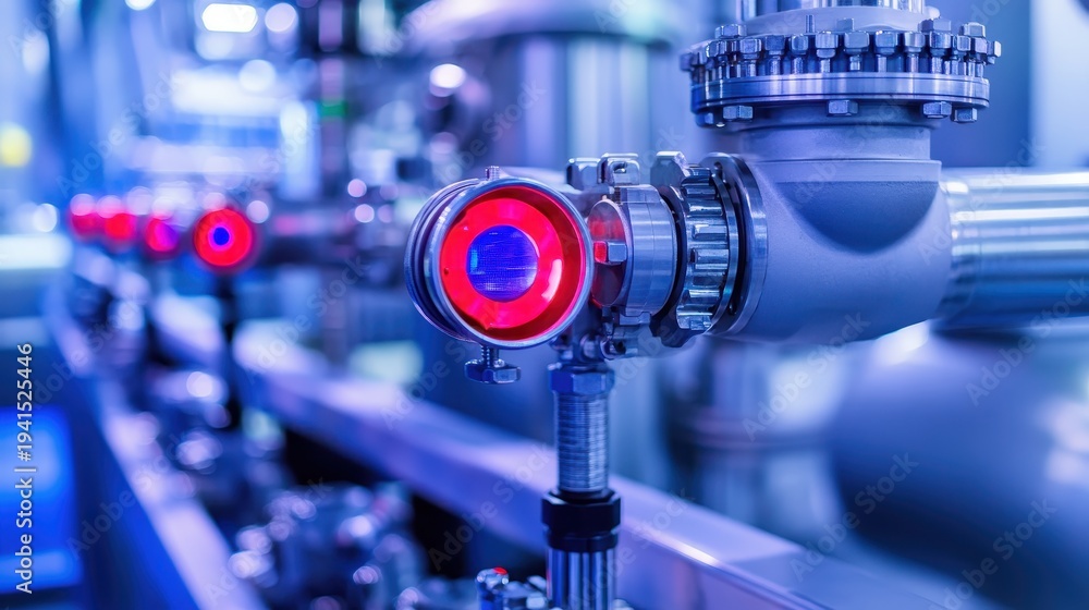 Close-up view of advanced industrial sensor with bright red and blue indicator lights, representing efficient energy production systems. #1941525446
