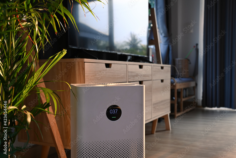 Close up view of portable air purifier on wooden floor in comfortable home for improve air quality and healthy life. #423654446
