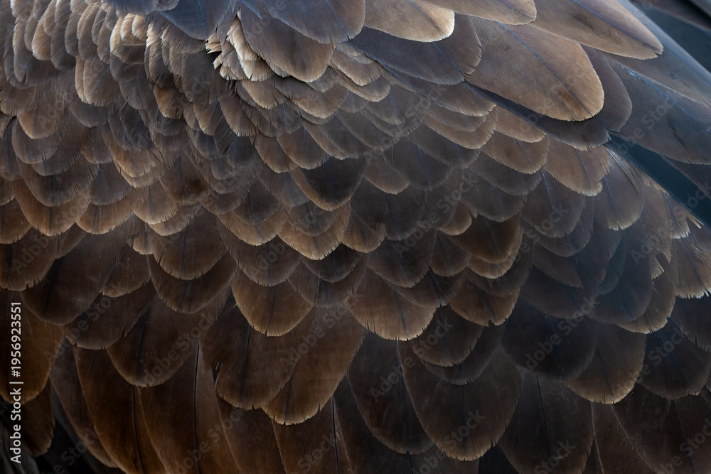 Close-up view of the detailed feathers of a large bird showcasing intricate patterns and rich textures in natural light during the golden hour #1956923551