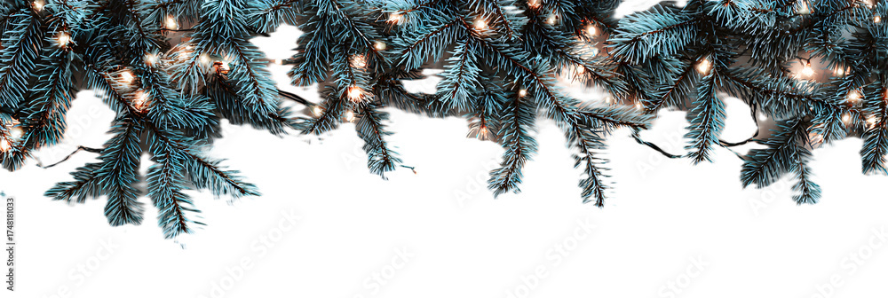 Closeup of a decorated christmas tree branch with twinkling lights, isolated on transparent background #1748181033