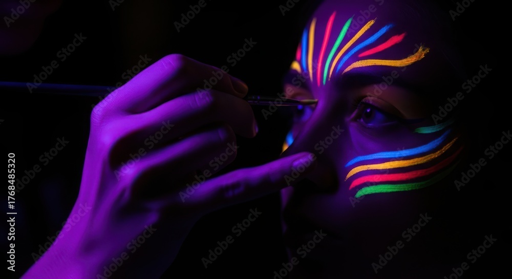 Closeup of a persons face being painted with neon colors under blacklight #1768485320