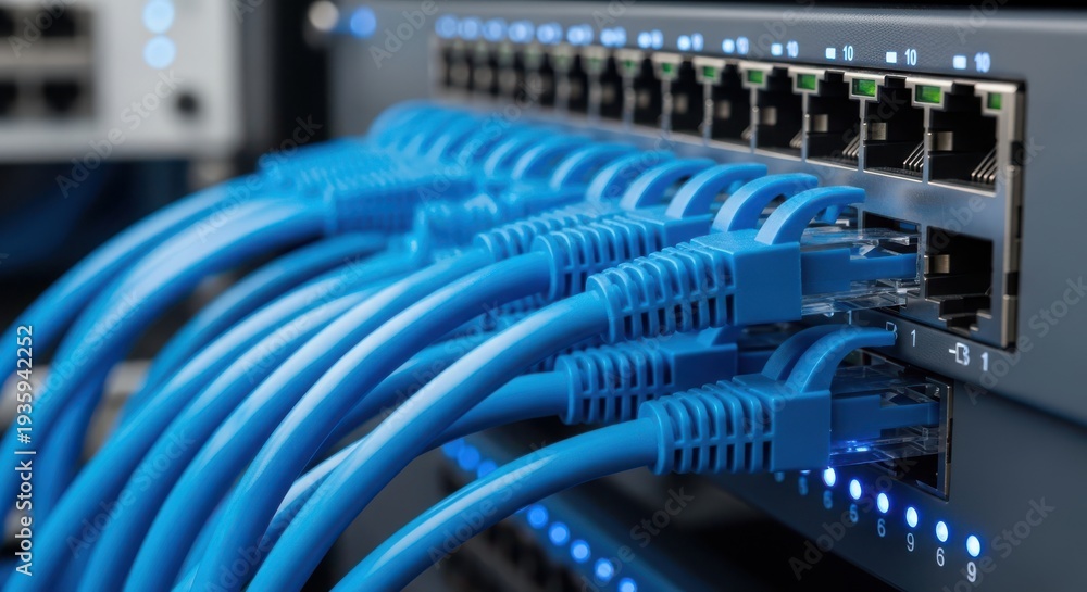 Closeup of bright blue ethernet network cables plugged into a server rack switch with active indicator lights #1935942252
