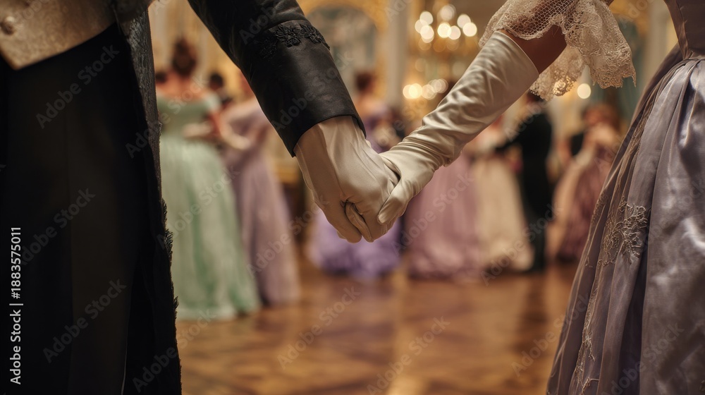 Closeup of elegant couple holding hands at Regency ball in historical costumes and white gloves #1883575011