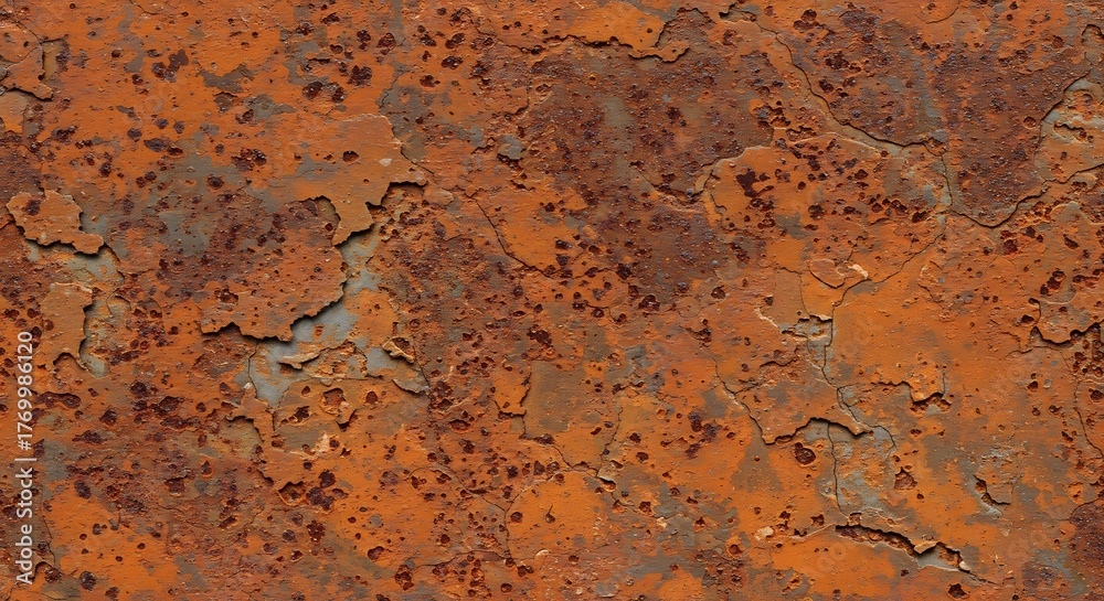 Closeup of heavily rusted metal showing peeling paint and mottled corrosion #1769986120