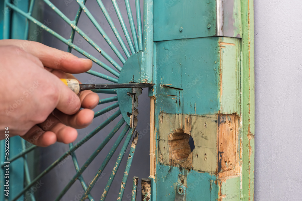 Closeup of man chiseling groove in door leaf for lock installation. Worker carving out door frame with tool, preparing area for lock replacement #1532235804