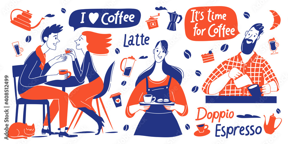 Coffee motivational vector design with barista and coffee elements and lettering #408512499