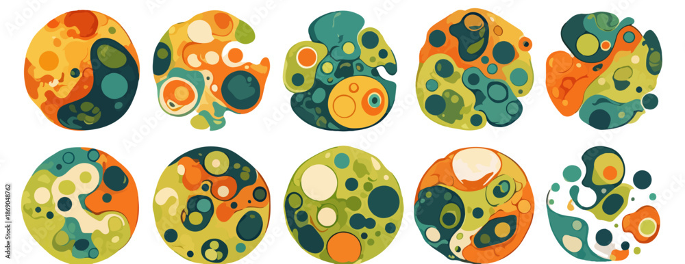 Colección de formas orgánicas abstractas y coloridas con patrones de círculos, ideales para fondos transparentes y diseños modernos. #1869048762