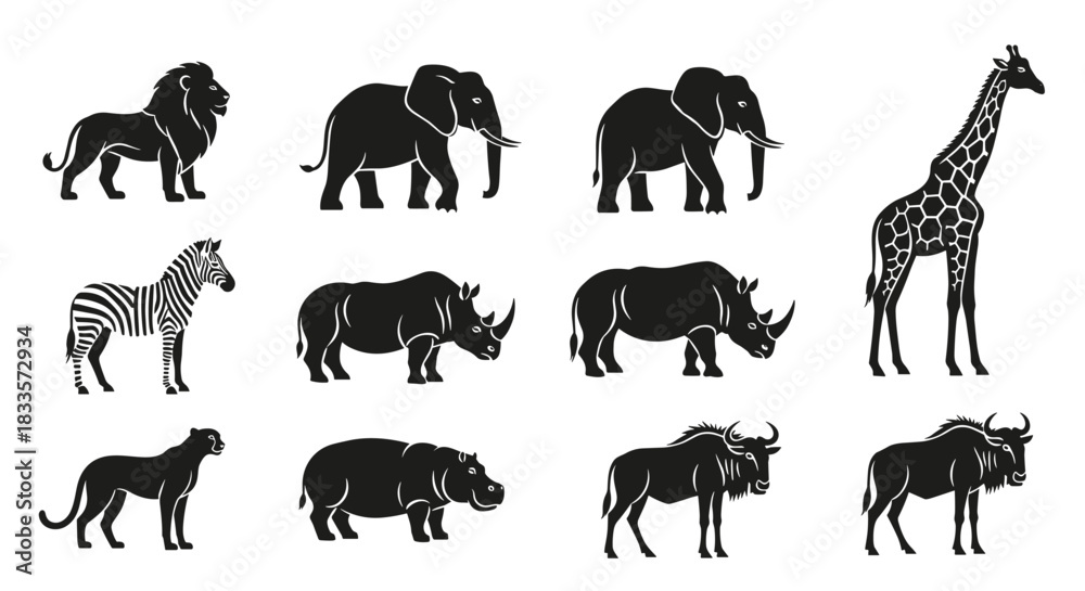 Collection of African Wildlife Silhouettes in Black and White. #1833572934