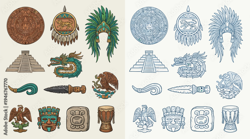 Collection of Aztec cultural symbols and artifacts, including pyramids, headdresses, masks, and weaponry, presented in both color and line art. #1946767770
